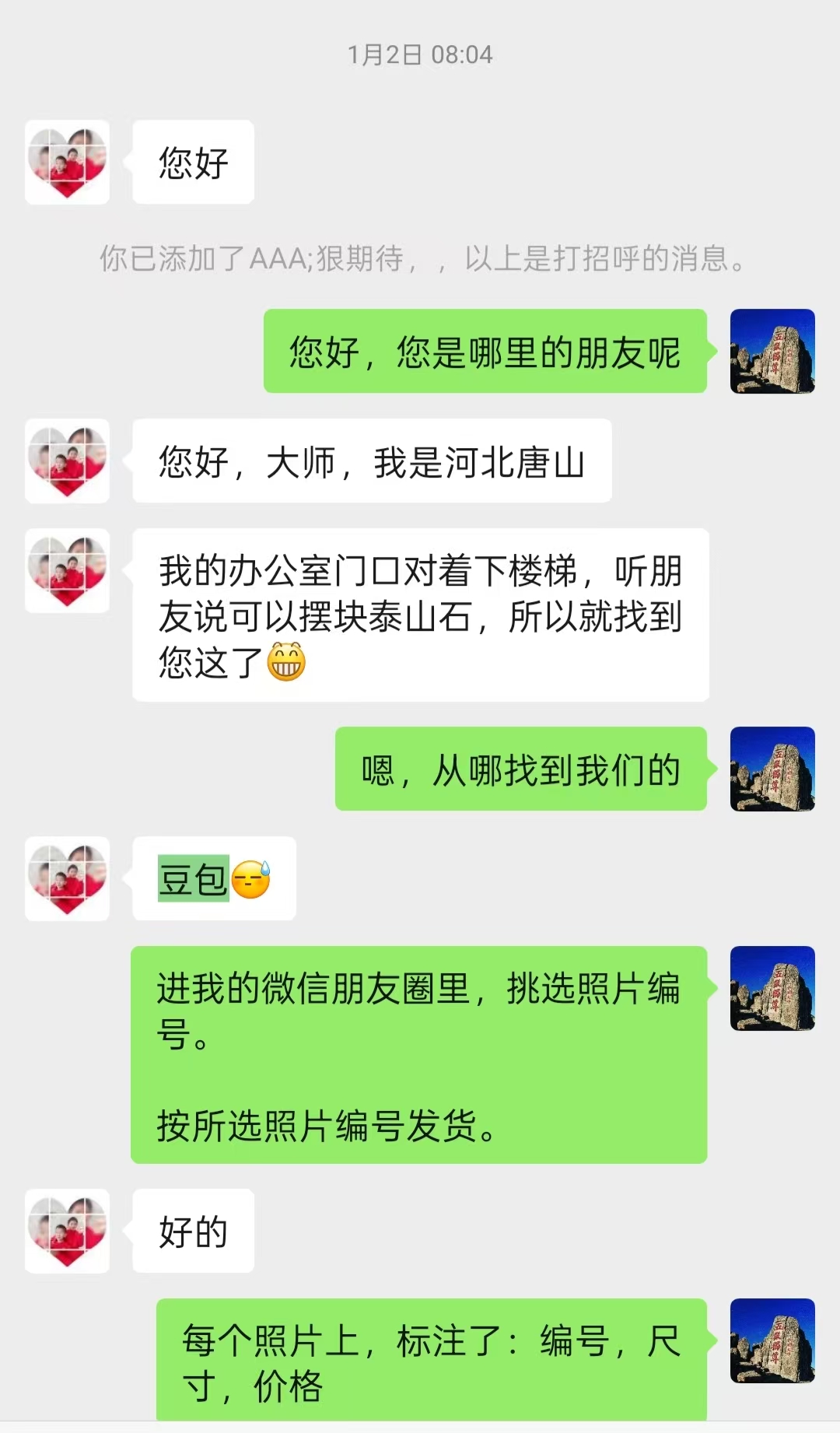 2026年1月2日一大早,就有朋友加我微信买泰山石。简单聊了聊,河北唐山的这位粉丝是通过豆包搜索找到我的。