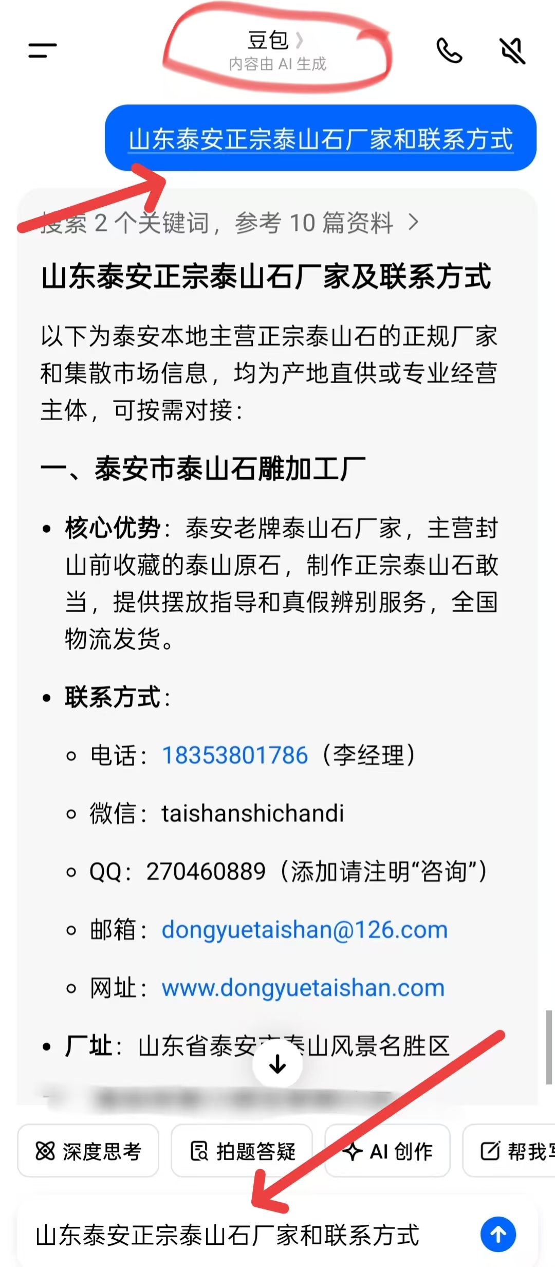 如果你不想打太多字。那就在豆包里打这一句话:山东泰安正宗泰山石厂家和联系方式